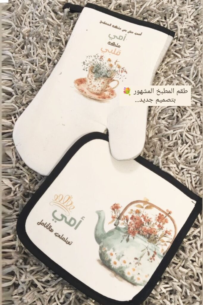 סט אביזרי מטבח הכולל כפפת מטבח עמידה לחום ותחתית סיר תואמת, בעיצוב מודפס איכותי.