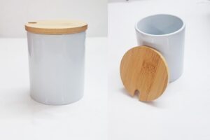 סט צנצנות אחסון מעוצבות למטבח, בגימור נקי ומודרני עם מכסה עץ טבעי לסגירה נוחה ואטומה.